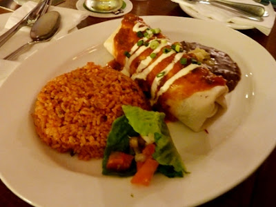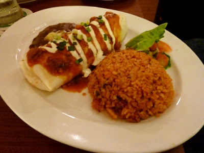 Homemade flour tortilla filled with your shredded chicken, refried bean cheese serve with Mexican rice.