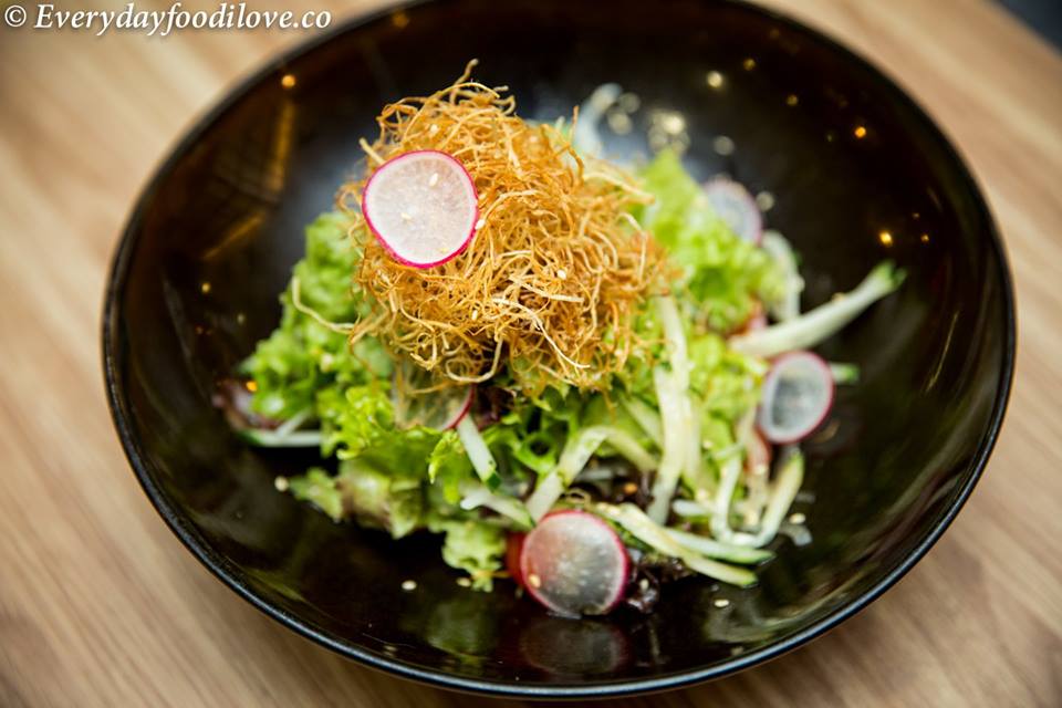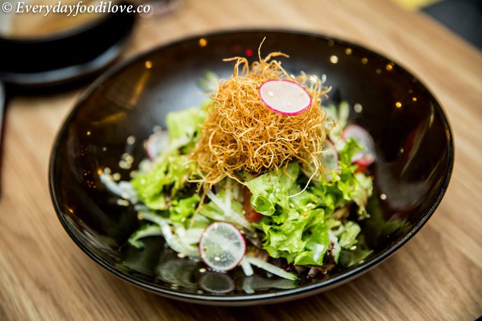 For salad, a unique salad dressing made by a dozen seasoning to induce sweet flavour of the vegetables. Salad, topped with healthy deep fried finely shredded burdock (牛蒡)