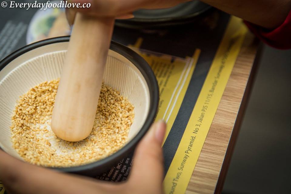 For the sauce, a specially selected high quality sesame seeds that contain high linoleic acid and rich in vitamin B1 and calcium. It helps to fight against atherosclerosis and lowering cholesterol. It make it even more delicious and healthy if mix with their homemade sauce.