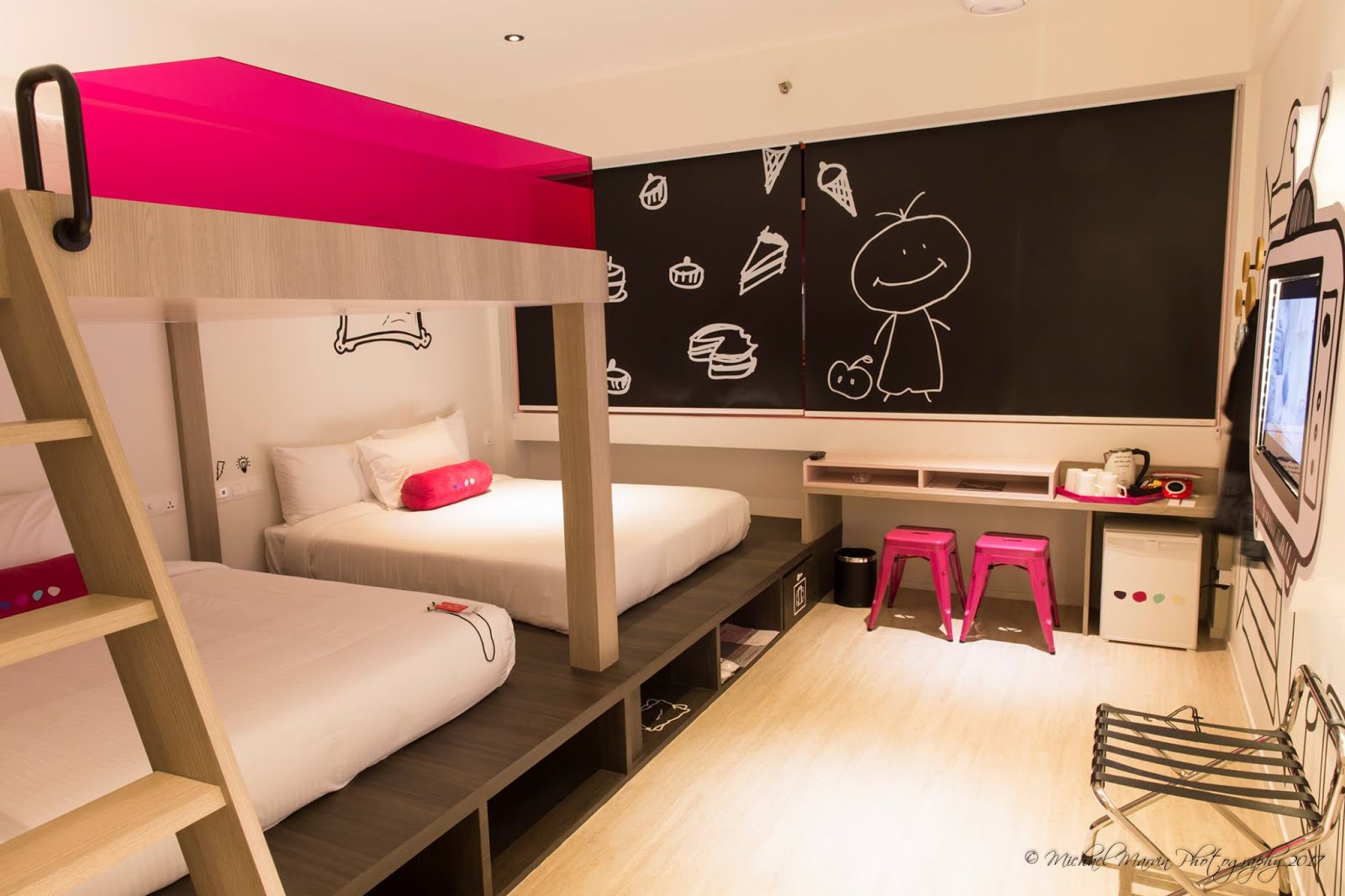 There are compartments built into the raised platforms hosting the beds, which are used to store luggage, while room safes are also built into the drawer space. Clothes are hung on knobs around which artists have drawn outlines of closets. White Blackout Roller Blinds with hand-drawn art by the large windows complete the ensemble.